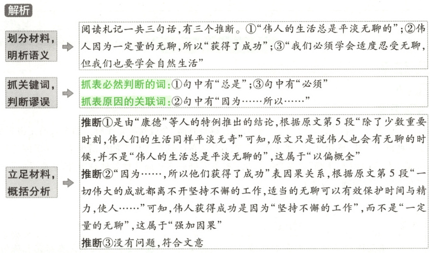 4.①以偏概全。伟人的生活也有某些重要时刻,并非“总是平淡无聊的”。②强加因果。一定量的无聊可以保护时间与精力,但伟人不是因为一定量的无聊才获得了成功。(每点2分)
