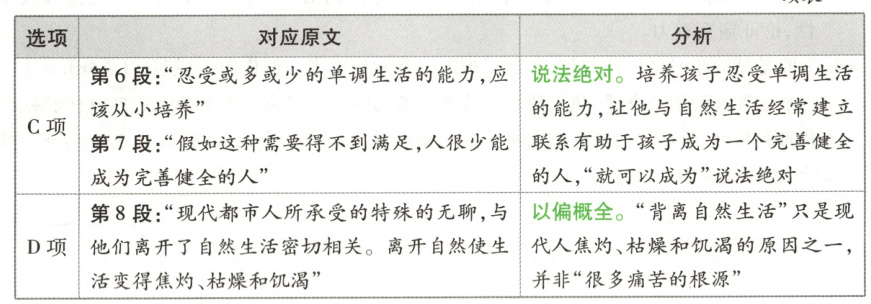 3.C C项,“指责现代许多娱乐方式的无聊,呼吁大家抵制刺激的放纵”错误,文章第7段将“以赌博为代表的许多娱乐”和“从自然生活中获得的那些乐趣”进行对比,是为了论证“亲近自然对人类的重要性”。