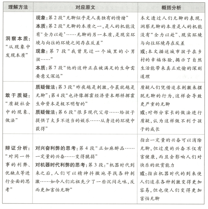 5.①洞察本质:透过人们无聊的表现,洞察无聊的本质是人的机能没有“全力以赴”、现实环境与向往环境存在反差(或“列举城市孩子在乡村美景中无比快乐这一现象,揭示自然生活能带来真正欢愉的深刻道理”)。②敢于质疑:对人们靠追求刺激来逃避无聊的行为进行质疑,认为这样做可能导致更为严重的无聊(或“对家长们给予孩子太多五光十色的东西的做法进行质疑,认为这样做不利于孩子的成长”)。③辩证分析:指出一定量的兴奋可以消除无聊,但过度的兴奋不仅有害健康,而且会影响人们对快乐的欣赏能力(或“指出机器时代的到来使人们追求各种刺激变得更加容易,但也使人们变得更加害怕无聊”)。(每点2分)解析 本题考的是“洞察本质、敢于质疑、辩证分析”三个“深化理性思考”的方法在原文的体现,首先要理解三个方法,然后回到原文找照应。
