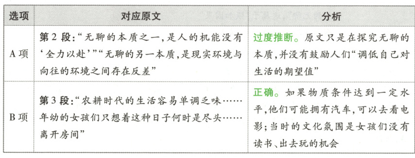 1.C C项,原因分析错误。由原文“然而,昨夜越是刺激,今晨就越是无聊。如今人们比祖先少了一些沉闷乏味,反而更加害怕无聊”可知,现代人的生活比古代人的生活少了一些沉闷乏味,而现代人“更加害怕无聊”是因为他们为了避免无聊而不断地寻找各种刺激,但是享受完刺激后会变得更加无聊。故选C。