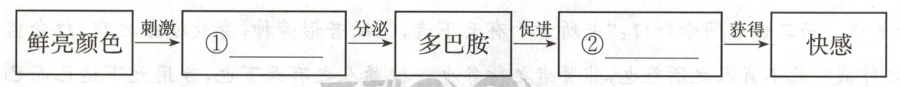22.请根据材料内容在图表①②处填写相应词语,理清“多巴胺穿搭”受到追捧的原理。(2分)