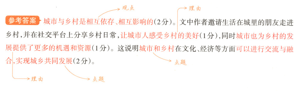 解题思路 第一步,根据文章内容和[资料链接],整体感知文章;第二步,结合具体内容分析城市与乡村之间的关系;第三步,结合实际情况,谈谈应该如何处理城市与乡村的关系。