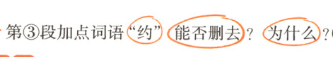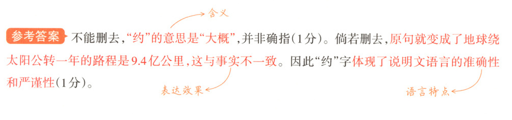 据题精析 “约”的意思是“大概”,表示估计、推测。在句子中表示地球围绕太阳进行公转,一年要走过的路程大约有9.4亿公里,这说明“9.4亿公里”只是一个估计、推测的数据,并非精确的数据。倘若去掉,原句的意思就变为地球围绕太阳公转一年走过的路程是9.4亿公里,表述过于绝对,与实际情况不符。因此“约”字体现了说明文语言准确、严谨的特点。