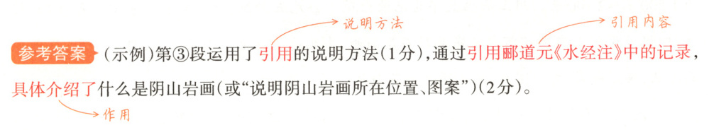 据题精析 阅读第③段,根据“阴山岩画……分布在东西约220千米、南北约60千米~120千米的范围内,海拔高度大约为1 800米~2 100米”可知,句中列举“220千米”“60千米~120千米”“1 800米~2 100米”等数字,是运用了列数字的说明方法,具体准确说明了阴山岩画的分布范围、海拔等。根据“阴山岩画最早的记录出现于公元五世纪,北魏地理学家郦道元在《水经注》中记录了阴山岩画:‘河水又东北历石崖山西,去北地五百里。山石之上,自然有文,尽若虎马之状,粲然成著,类似图焉,故亦谓之画石山也。’”可知,此处运用了引用的说明方法,既对阴山岩画所在位置、图案作了解释说明,又指出阴山岩画具有悠久的历史。据此选择其中一种说明方法,分析作答即可。