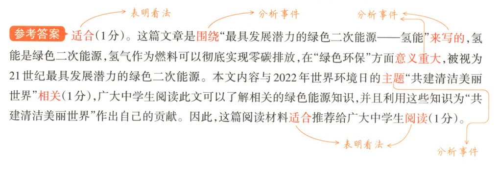 据题精析 通读全文可知,文章围绕“最具发展潜力的绿色二次能源——氢能”展开说明。根据第①段中的“氢燃料在燃烧过程中不排放二氧化碳”和第②段中的“最重要的一点是,氢气仅仅含有氢元素,燃烧的产物只有水,而传统的化石燃料因为含有碳元素,所以燃烧时会产生大量的二氧化碳。因此氢气作为燃料可以彻底实现零碳排放,在‘绿色环保’方面意义重大,被视为21世纪最具发展潜力的绿色二次能源”可知,氢能是绿色二次能源,氢气作为燃料可以彻底实现零碳排放,在“绿色环保”方面意义重大。因此本文介绍的内容与2022年世界环境日“共建清洁美丽世界”的主题一致,由此可判断这篇阅读材料适合推荐给广大中学生阅读。