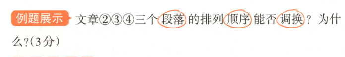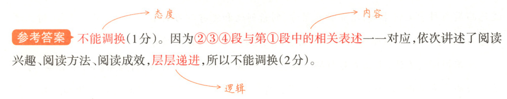 解题思路 第一步,表明态度,一般为“不能调换”;第二步,分析②③④三个段落之间的逻辑关系,说明不能调换的理由。