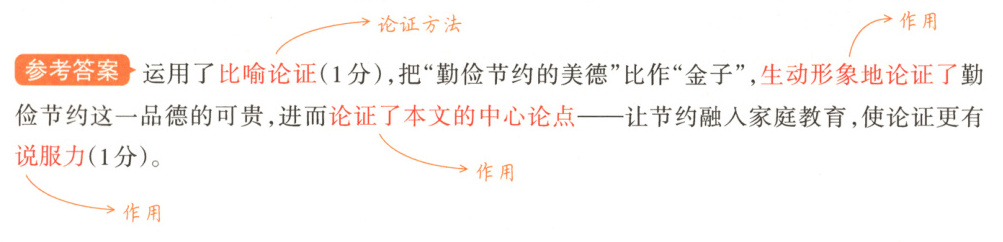据题精析 根据题干信息可知,需要分析文章第②段画线句运用的论证方法及其作用。阅读画线句可知,画线句把“勤俭节约的美德”比作“金子”,这是运用了比喻论证,生动形象地阐明了勤俭节约这一道德品质如金子般可贵,进而论证了本文的中心论点——让节约融入家庭教育。