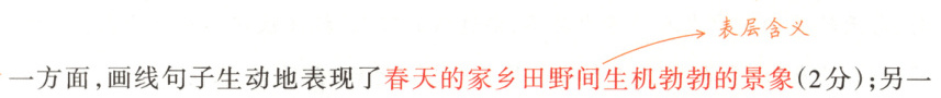 据题精析 阅读第⑦段画线句子,结合第①段中的“回到故乡闽中,正是春天”、第⑥段中的“入眼舒朗的还有渠水淙淙的田野”和第⑦段中的“面对这明媚的春色,我真想把自己变成一枚书签,夹进故乡生机勃勃的书页里”可知,画线句子的表层含义指春天到来,田野到处呈现出生机勃勃的景象。结合第⑥段的内容和第⑦段中的“这些年,故乡的变化快了起来。有人办企业,有人建蔬菜大棚,有人买汽车跑运输,有人在网上做电商……乡亲们都过上了富裕、美好的生活”可知,过去的田野见证了乡亲们农事的艰辛和生活的愁苦,但随着时代的飞速发展,乡亲们寻求多样发展,过上了富裕美好的生活。由此可知,句子运用了比喻的修辞手法,将乡亲们乘着时代的东风迎来幸福美好的生活比作田野又迎来一个春天,表达了作者对当今时代发展的赞美与歌颂。
