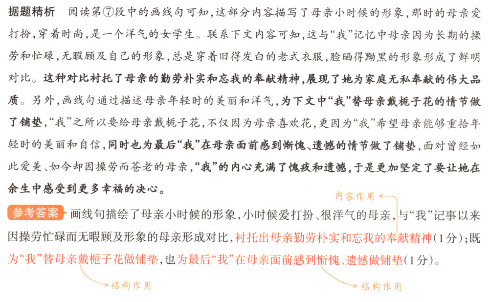 解题思路 第一步,阅读句子,理解句意;第二步,结合具体语境,分析其在内容上的作用;第三步,结合句子位置及全文结构,分析其在结构上的作用。