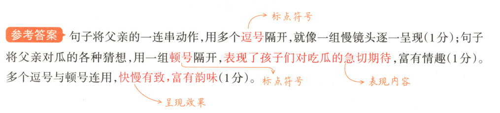 据题精析 阅读句子可知,句子把“敲敲”“听听”“相相”“猜猜”等动作用逗号隔开,相当于把父亲切瓜前的动作拉长,将其切瓜前的准备工作逐一展现出来,极具画面感。根据“猜猜红瓤、黄瓤、皮薄、皮厚、沙不沙、熟不熟、甜不甜”可知,句子将父亲切瓜前的猜测用顿号隔开,顿号原表示句中并列的词语或短语间较小的停顿,用在此处罗列猜测且停顿较小,表现出孩子们对吃瓜的急切期待。这句话先放慢镜头展现父亲准备切瓜的动作,再加快速度写父亲切瓜前的猜测,快慢有致,极具趣味,让人体会到儿时吃瓜的快乐氛围。