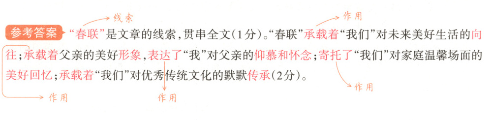 考点推导 题干关键点:“春联”;多次出现;作用 → 考查分析文章线索及其作用