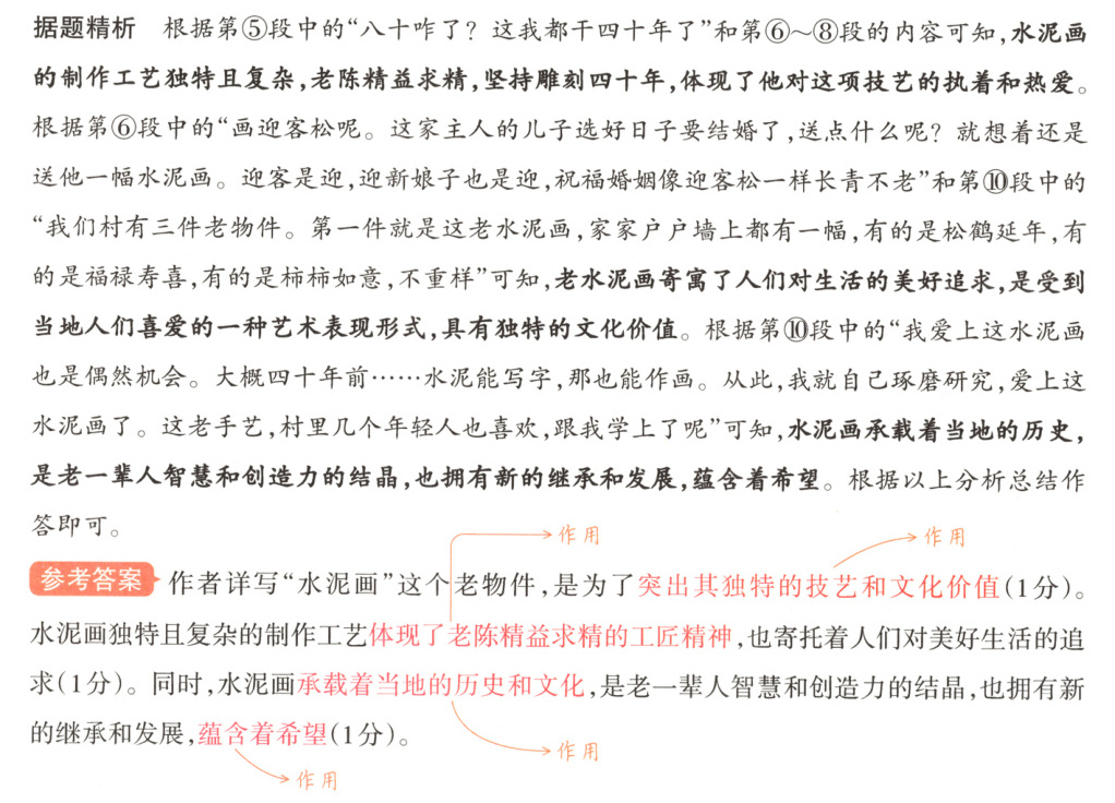 解题思路 第一步,根据题干信息,阅读“水泥画”相关内容;第二步,结合文中的关键语句及详写作用的知识,分析为什么详写“水泥画”。