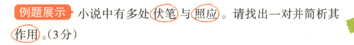 三 段 式 解 析考点推导 题干关键点:伏笔;照应;作用 → 考查分析写作特色(表现手法)解题思路 第一步,阅读题干,明确题干要求;第二步,根据题干信息抓住关键语句,结合上下文语境,分析运用该表现手法在表情达意上的作用。据题精析 根据题干信息可知,文中多处运用了伏笔和照应的表现手法。如第②段中的“这几天,松花江上游的抗日游击队把小鬼子打惨了,也把他们打急了,所以小鬼子不断进山‘讨伐’,进山的路巡查得非常严”与第⑤段中的“突然,远处出现了一片黄褐色的身影,还伴随着隐隐约约的马达声。不好,是鬼子的巡逻队!”相照应,突出了为游击队送粮的危险,表现了老赵头等人爱护抗联战士、保家卫国的决心。再如第⑧段中的“‘爬犁帮’的人谈‘龙’色变,因为不管什么车辆或者爬犁,若是掉进了‘龙豁口’,都是九死一生的事”与第⑮段“第二天往回走时,他们远远地看向‘龙豁口’,只见黑幽幽的江面上,漂着一片黄乎乎的尸体。有的尸体已经冻在了‘龙豁口’的冰凌上”相照应,表现了“龙豁口”的凶险,反衬出老赵头等人爱护抗联战士、保家卫国的决心和不怕牺牲、机智勇敢的宝贵品质。也可选择其他句子分析作答。参考答案 (示例)第②段中的“这几天,松花江上游的抗日游击队把小鬼子打惨了,也把他们打急了,所以小鬼子不断进山‘讨伐’,进山的路巡查得非常严”(1分)与第⑤段中的“突然,远处出现了一片黄褐色的身影,还伴随着隐隐约约的马达声。不好,是鬼子的巡逻队!”(1分)相照应,突出了为游击队送粮的危险,表现了老赵头等人爱护抗联战士、保家卫国的决心(1分)。