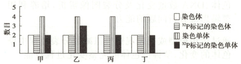 [例] (2024·浙江 6 月选考)某二倍体动物$(2n = 4)$精原细胞 DNA 中的 P 均为$^{32}P$,精原细胞在不含$^{32}P$的培养液中培养,其中 1 个精原细胞进行一次有丝分裂和减数第一次分裂后,产生甲~丁 4 个细胞。这些细胞的染色体和染色单体情况如图所示。
