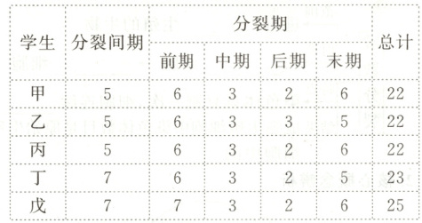 B.五位同学记录的中期细胞数一致,原因是中期染色体排列在细胞中央,易区分