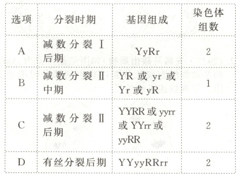 [例] (2024·天津高考)某豌豆基因型为YyRr,Y/y和R/r位于非同源染色体上,在不考虑突变和染色体互换的前提下,其细胞分裂时期、基因组成、染色体组数对应关系正确的是(
