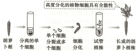 植物组织培养(以胡萝卜组织培养为例):高度分化的植物细胞具有全能性。