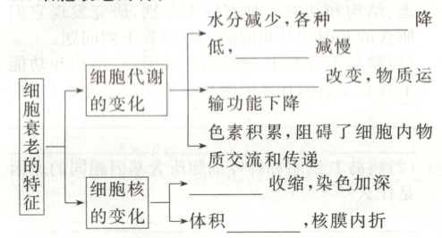 细胞核的变化:染色质收缩,染色加深;体积增大,核膜内折。