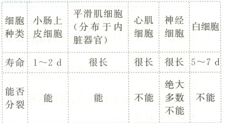 (1)细胞的寿命与分裂能力无对应关系。寿命短的细胞不一定能分裂(如白细胞),而寿命长的细胞也不一定不能分裂(如平滑肌细胞)。
