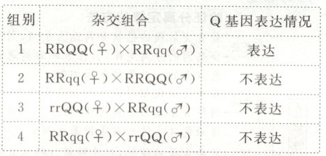 (3) R基因(母本)编码的DNA去甲基化酶可促进胚乳中母本来源的Q基因表达;父本来源的Q基因不表达;当母本为RR时,其提供的Q基因(母本基因型为QQ)在去甲基化酶作用下去甲基化而表达;若母本为rr(无功能性去甲基化酶)或母本不提供Q基因(母本基因型为qq),则Q基因不表达