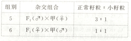 (4) 实验中还发现另外一个籽粒变小的突变株甲,经证实,突变基因不是R或Q。将甲与野生型杂交,F₁表型正常,F₁配子的功能及受精卵活力均正常。利用F₁进行下列杂交实验,统计正常籽粒与小籽粒的数量,结果如表2。