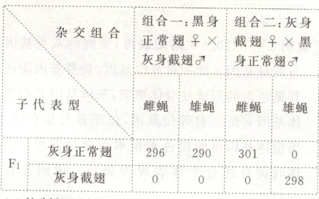 (1) X;组合二中,子代雌蝇全为正常翅,雄蝇全为截翅(或正反交实验中翅型的遗传与性别相关联)。