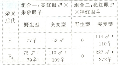 。(2) 组合二中亮红眼果蝇与猩红眼果蝇杂交,$F_{1}$、$F_{2}$果蝇中没有出现野生型,则可以推测亮红眼基因与猩红眼基因的关系是____。