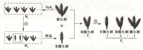 1. (2024·福建卷节选)簇生稻具有多稻粒着生成簇的特点。为确定调控簇生表型的基因,我国科研人员用叠氮化钠(NaN₃)处理簇生稻(三粒一簇)种子,获得大量诱变株(M₁),并从M₁自交后代M₂中筛选出2个非簇生稻突变体株系开展相关研究,最终确定BRD3基因参与调控簇生表型,部分流程如图所示。