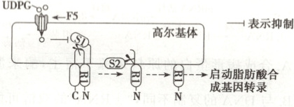 2. (2024·湖南卷)非酒精性脂肪性肝病是以肝细胞的脂肪变性和异常贮积为病理特征的慢性肝病。葡萄糖在肝脏中以糖原和甘油三酯两种方式储存。蛋白 R1 在高尔基体膜上先后经 S1 和 S2 蛋白水解酶酶切后被激活,进而启动脂肪酸合成基因(核基因)的转录。糖原合成的中间代谢产物 UDPG 能够通过膜转运蛋白 F5 进入高尔基体内,抑制 S1 蛋白酶的活性,调控机制如图所示。下列叙述错误的是 (