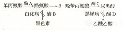 1. 白化病和黑尿病都是因为酶缺陷引起的分子遗传病,前者不能由酪氨酸合成黑色素,后者不能将尿黑酸转变为乙酰乙酸,排出的尿液中因含有尿黑酸,遇空气后氧化变黑。如图表示人体内与之相关的一系列生化过程,据图分析,下列叙述不正确的是(