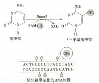 3. (情景探究)在一个蜂群中,少数幼虫一直取食蜂王浆而发育成蜂王,而大多数幼虫以花粉和花蜜为食将发育成工蜂。Dnmt3蛋白是Dnmt3基因表达的一种DNA甲基化转移酶,能使DNA某些区域添加甲基基团(如图所示),DNA被甲基化后会干扰RNA聚合酶的识别。敲除Dnmt3基因后,蜜蜂幼虫将发育成蜂王,这与取食蜂王浆有相同的效果。