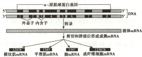 [例1] 真核生物的某些基因的编码序列是不连续的,编码序列(外显子)被不编码序列(内含子)所间隔。如图是α—原肌球蛋白基因转录产物(前体mRNA)以不同方式进行剪切和拼接,产生不同mRNA的过程示意图。下列叙述错误的是(