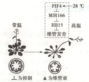 1. (2025·重庆一中高三月考)西南大学罗克明团队揭示了高温抑制拟南芥花序茎中维管发育,导致植株细弱、易倒伏。如图所示,温度信号关键因子PIF4通过抑制MIR166表达以释放转录因子HB15,抑制HD—ZIPIII基因表达,进而影响花序茎中的维管束数目和细胞壁形成。则下列说法错误的是(