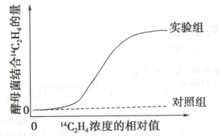 混合 6 小时,通过离心分离酵母菌,再检测酵母菌结合¹⁴C₂H₄ 的量。(4)实验三中随着¹⁴C₂H₄ 相对浓度升高,实验组曲线上升趋势变缓的原因是____。