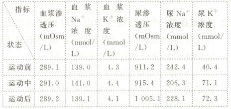 。(3) 运动中,尿液中Na⁺浓度降低、K⁺浓度升高,是因为