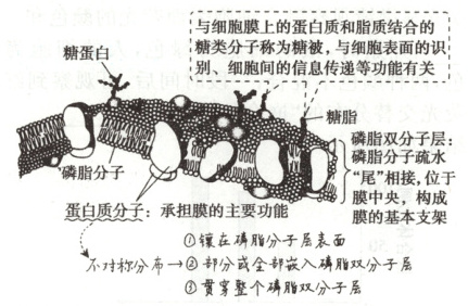 不对称分布:①镶在磷脂分子层表面;②部分或全部嵌入磷脂双分子层;③贯穿整个磷脂双分子层