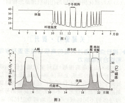5. (2023·辽宁卷)随着人类星际旅行计划的推进,如何降低乘员代谢率以减少飞船负载是关键问题之一,动物的冬眠为人类低代谢的研究提供了重要参考。图 1 显示某储脂类哺乳动物的整个冬眠过程包含多个冬眠阵。每个冬眠阵由入眠、深冬眠、激醒和阵间觉醒四个阶段组成,其体温和代谢率变化如图 2,回答下列问题。
