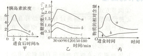 ③图丙中物质a为葡萄糖,由消化道进入血液导致血糖浓度升高并出现ab段变化,如果表中三组数据,即图甲(胰岛素水平)、图乙(血糖浓度变化)、图丙(物质吸收后浓度变化,如葡萄糖),若为正常人的摄取葡萄糖后浓度,乙的数值(血糖浓度)应在$3.0-7.5mmol/L$间波动,即图乙中a段对应数值,甲的数值(胰岛素水平)应对应图甲中a′段,即随血糖浓度上升胰岛素分泌增加,丙的数值(葡萄糖吸收后浓度变化)应对应图丙中a段,即葡萄糖吸收后浓度上升。
