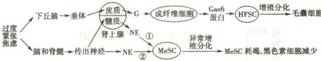 6. 过度紧张、焦虑等刺激不仅会导致毛囊细胞数量减少引起脱发,也会导致黑色素细胞减少引起头发变白。利用黑毛小鼠进行研究得出的相关调节机制如图所示。