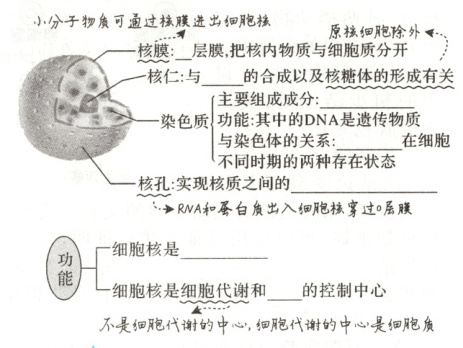 (1)核膜允许水分子、离子等小分子通过,不允许大分子物质自由通过;核孔允许mRNA、蛋白质等通过,不允许DNA出核。