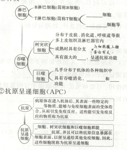 )、吞噬细胞(如巨噬细胞和树突状细胞),生来就有,是机体在长期进化过程中遗传下来的,不针对某一类特定的病原体);特异性免疫(第三道防线,主要由淋巴细胞参与,针对特定的抗原起作用)解读:①溶菌酶杀菌一定是非特异性免疫,唾液中的溶菌酶为第一道防线,血浆中的溶菌酶为第二道防线。②吞噬细胞可以直接吞噬杀灭病原体,属于第二道防线;同时吞噬细胞又参与第三道防线,能处理抗原并将抗原传递给辅助性T细胞。