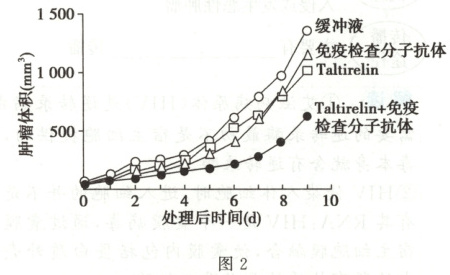 (2) 为评估Tal与免疫检查分子抗体的联合抗肿瘤效应,设置4组肿瘤小鼠,分别用4种溶液处理后检测肿瘤体积,结果如图2。设置缓冲液组的作用是____。据图2可得出结论:____。