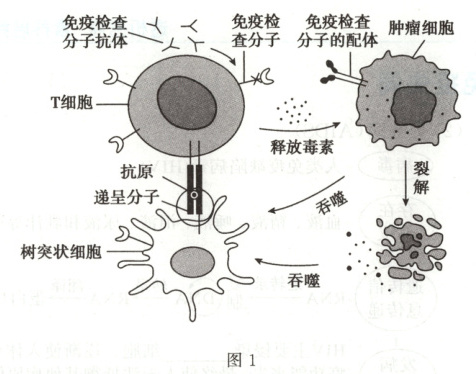 (1) 肿瘤细胞表达能与免疫检查分子特异结合的配体,抑制T细胞的识别,实现免疫逃逸。据图1可知,以