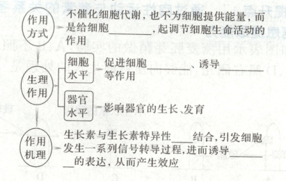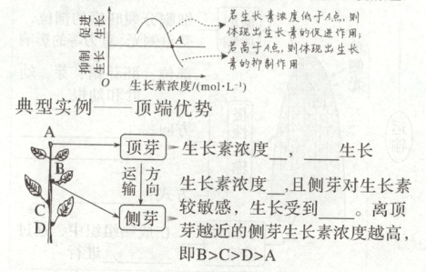 生长素的作用特点:低浓度促进生长,高浓度抑制生长(抑制生长≠不生长只是生长慢于对照组)典型实例——顶端优势