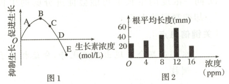 1. 图1曲线表示不同生长素浓度对某植物茎生长的影响,图2是用不同浓度的生长素类调节剂溶液处理扦插枝条的实验结果。下列分析正确的是(