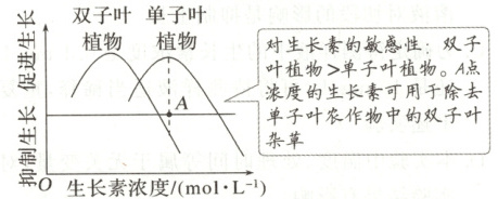(2)敏感程度:双子叶植物>单子叶植物;A点浓度:抑制双子叶植物生长,促进单子叶植物生长,用于除去单子叶作物中的双子叶杂草。