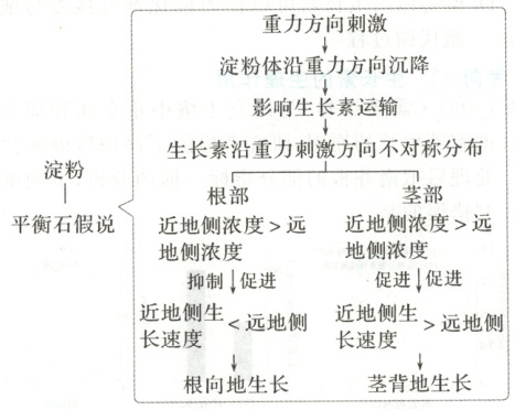 1. 重力刺激→淀粉体沿重力方向沉降→影响生长素运输→生长素沿重力方向不对称分布。