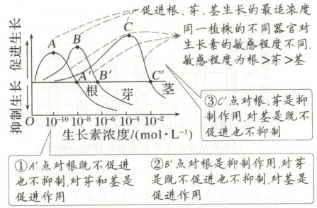 (1)敏感程度:根>芽>茎;A:促进根生长的最适浓度;B:促进芽生长的最适浓度;C:促进茎生长的最适浓度;A':根既不促进也不抑制,芽、茎促进作用;B':根抑制作用,芽既不促进也不抑制,茎促进作用;C':根、芽抑制作用,茎既不促进也不抑制。