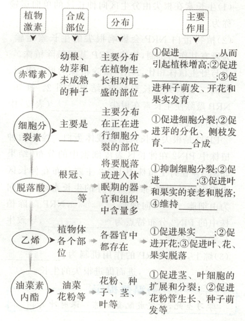 |乙烯|植物体各个部位|各器官中都存在|①促进果实成熟;②促进开花;③促进叶、花、果实脱落|