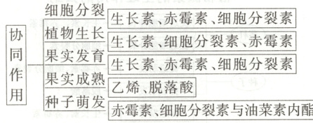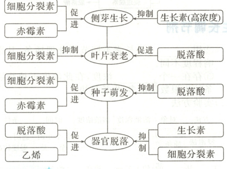 (2)侧芽生长:细胞分裂素促进,高浓度生长素抑制;叶片衰老:细胞分裂素抑制,脱落酸促进;种子萌发:细胞分裂素、赤霉素促进,脱落酸抑制;器官脱落:脱落酸、乙烯促进,生长素、细胞分裂素抑制。